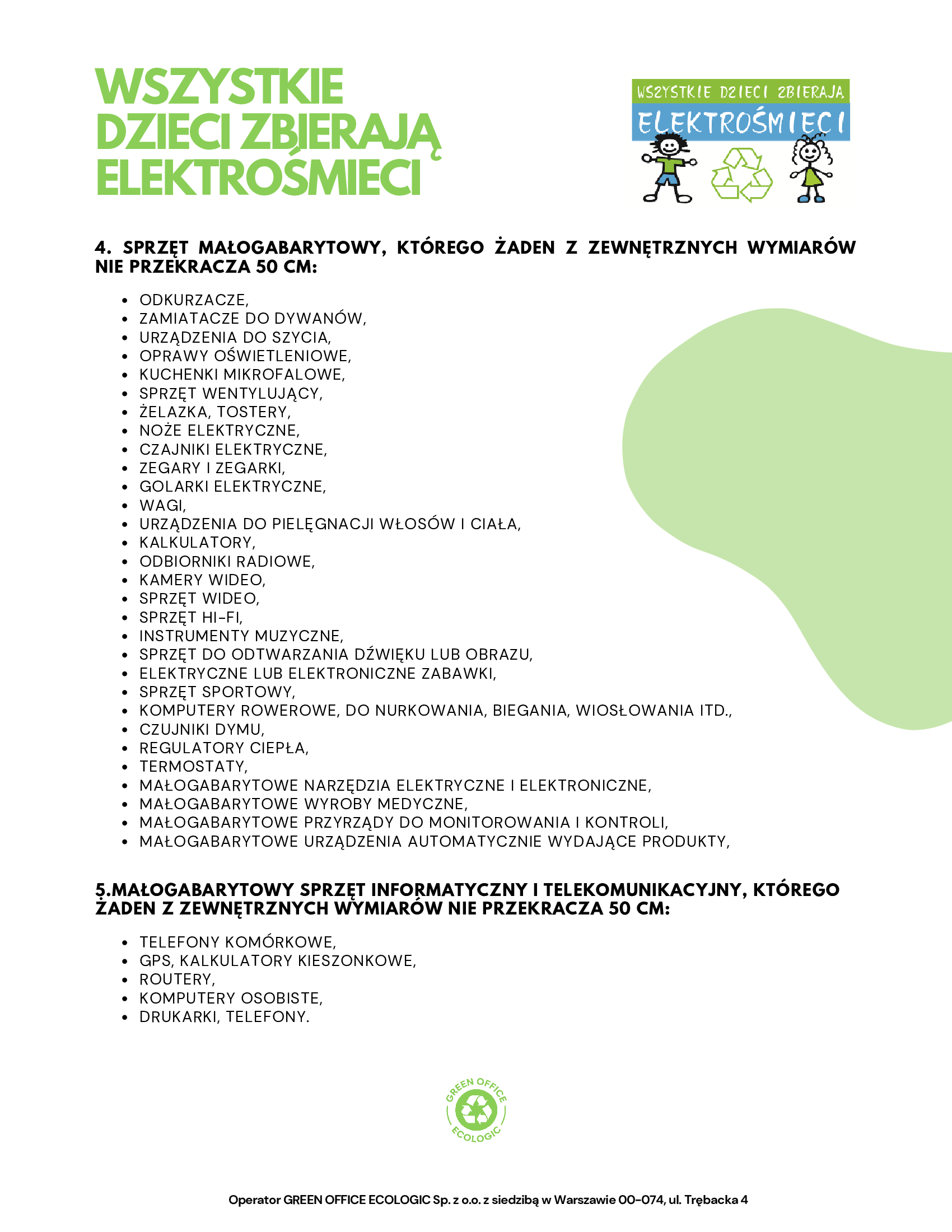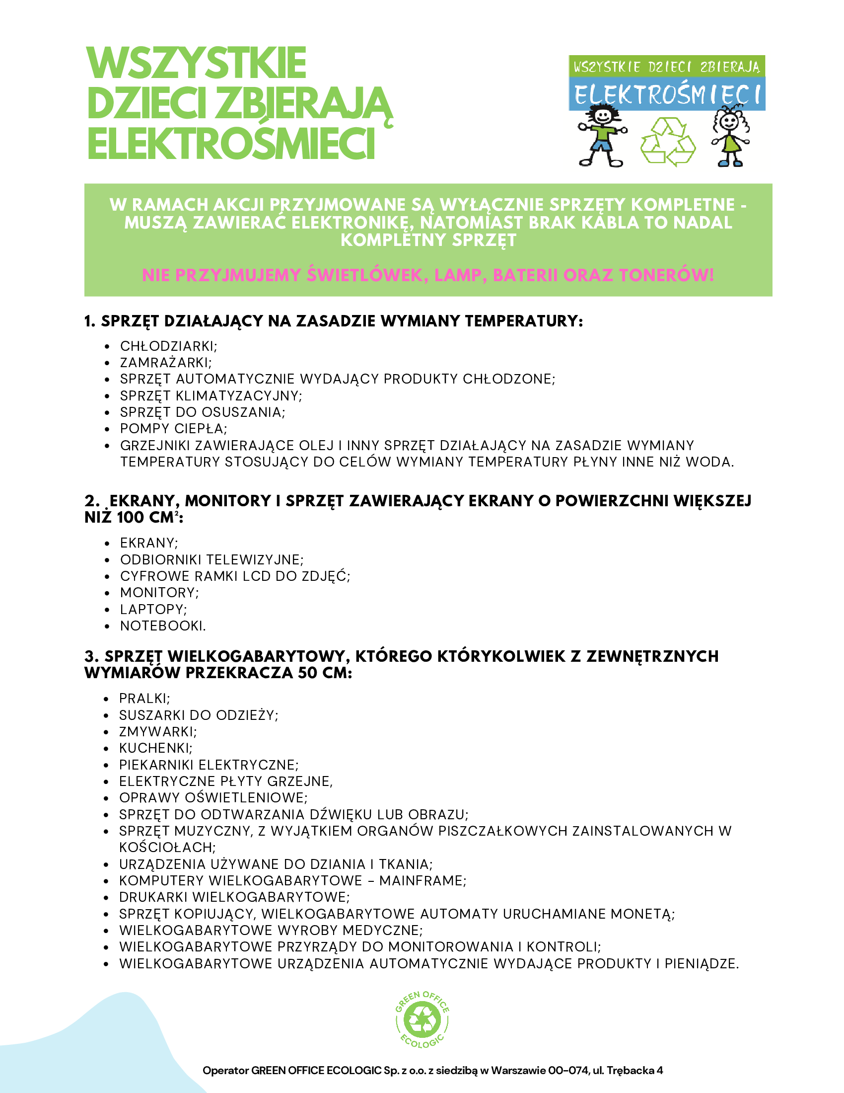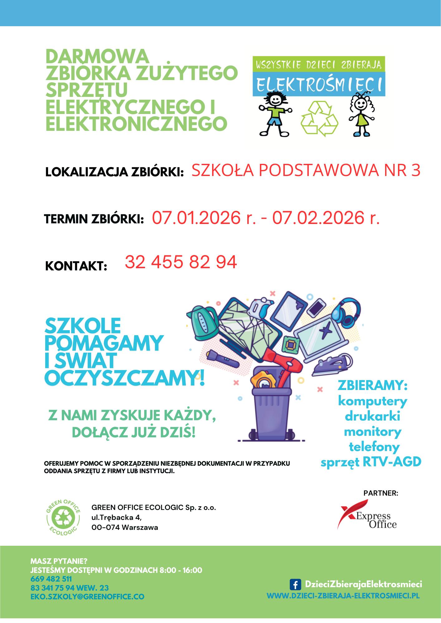 DRODZY UCZNIOWIE I RODZICE! Nasza szkoła przystąpiła do projektu ekologicznego „WSZYSTKIE DZIECI ZBIERAJĄ ELEKTROŚMIECI”. Celem akcji jest podniesienie świadomości ekologicznej wśród Dzieci i Młodzieży oraz zwrócenie uwagi na prawidłowe gospodarowanie odpadami. W zamian za przyniesiony zużyty sprzęt elektroniczny i elektryczny szkoła otrzyma bon, który wykorzysta na nagrody rzeczowe w postaci materiałów biurowych.